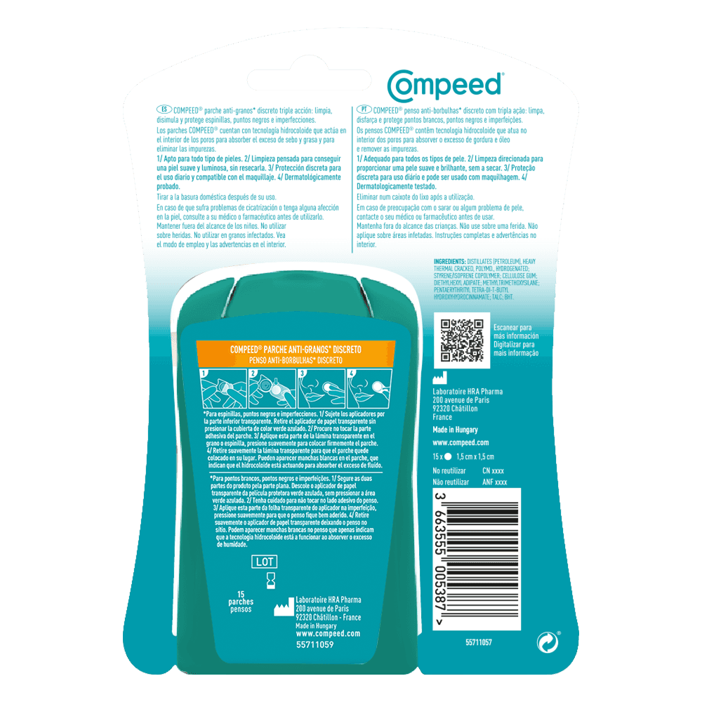 Os pensos Compeed® Anti-Borbulhas* Penso Discreto ajudam a limpar, esconder e proteger os *pontos brancos, os pontos negros e as imperfeições. Os pensos Compeed® Anti-Borbulhas* Penso Discreto usam tecnologia hidrocoloide para criarem um ambiente ideal para o tratamento da sua pele. Estes pensos hidrocoloides foram concebidos para surtos localizados, proporcionando uma proteção diária discreta e uma pele suave, revelando uma tez macia e iluminada. Também disponíveis para zonas grandes propensas a imperfeições.