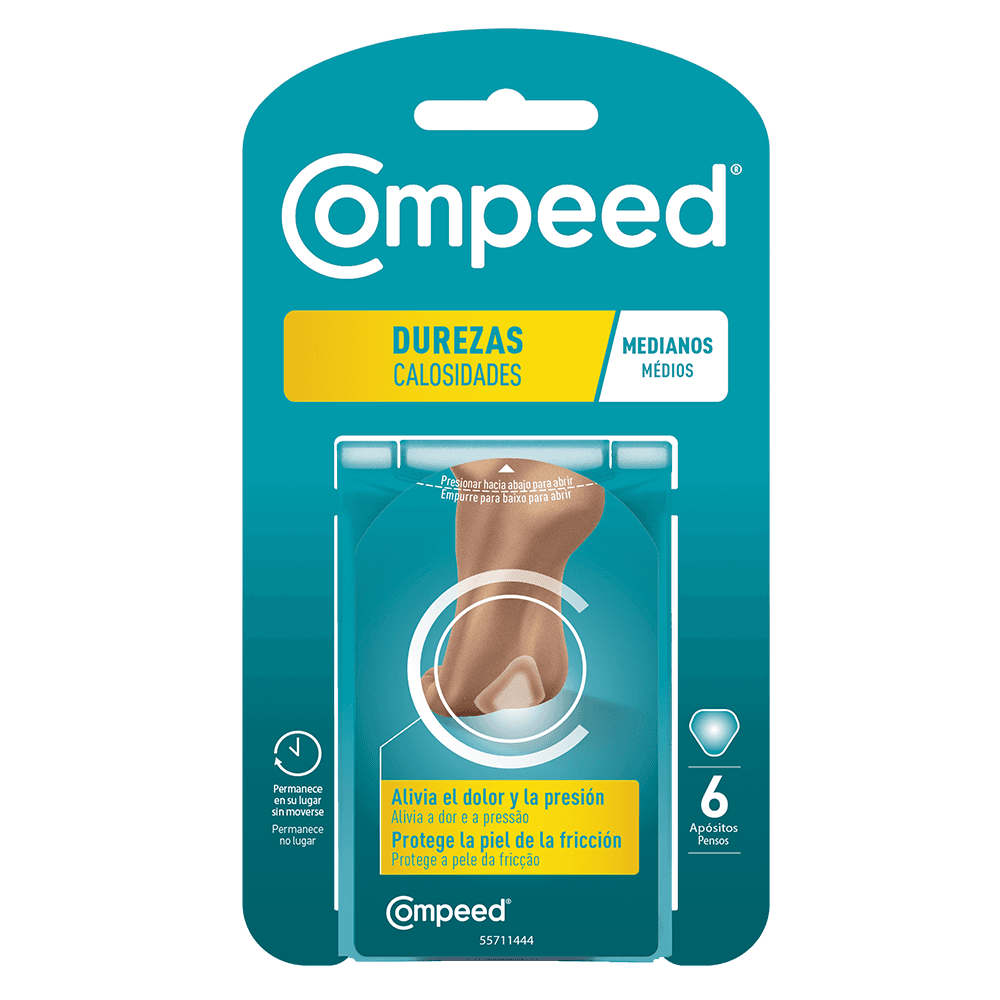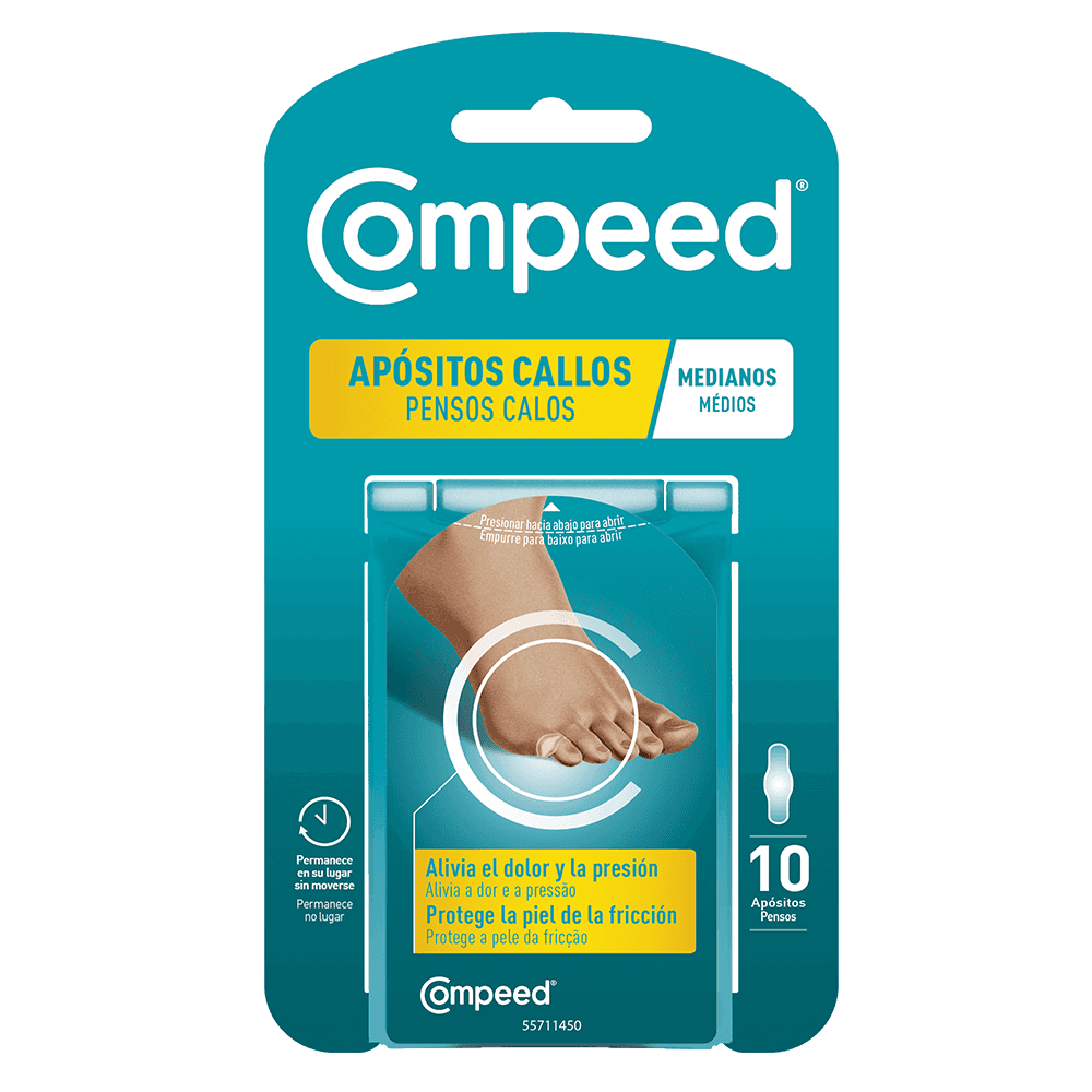 Os Pensos Compeed® Calos foram concebidos para ajudar a remover os calos de forma rápida e natural. Proporcionam alívio imediato da pressão e hidratação. . Os Pensos Compeed® Calosidades foram concebidos para suavizar e facilitar a remoção das calosidades. Proporcionam um ambiente protetor e húmido, ao mesmo tempo que aliviam a pressão e a dor.
